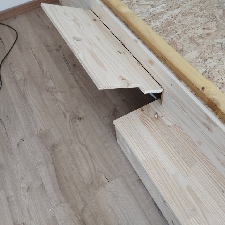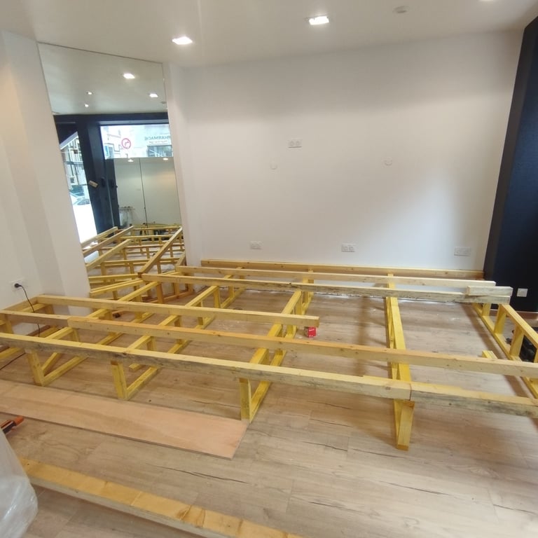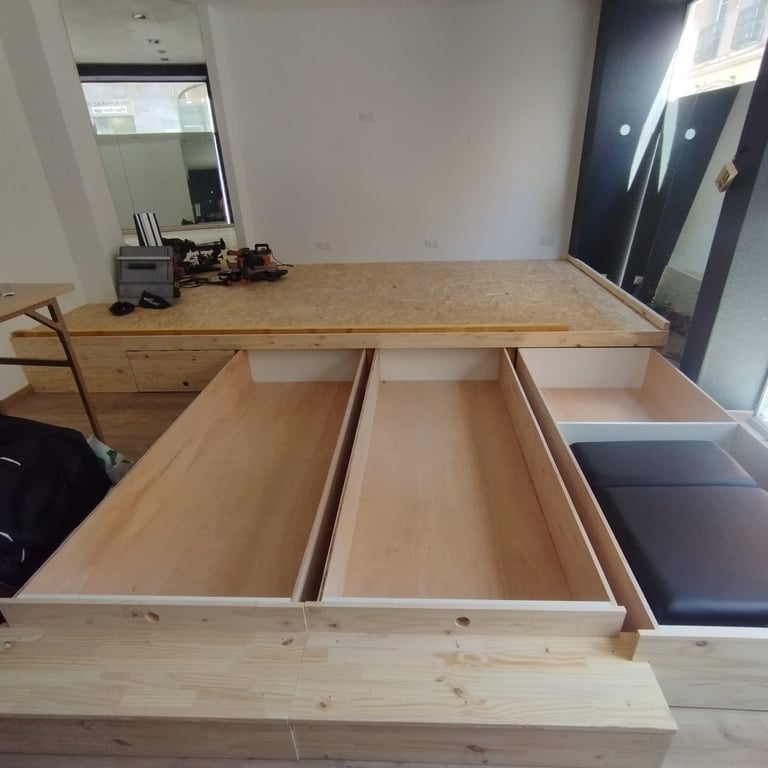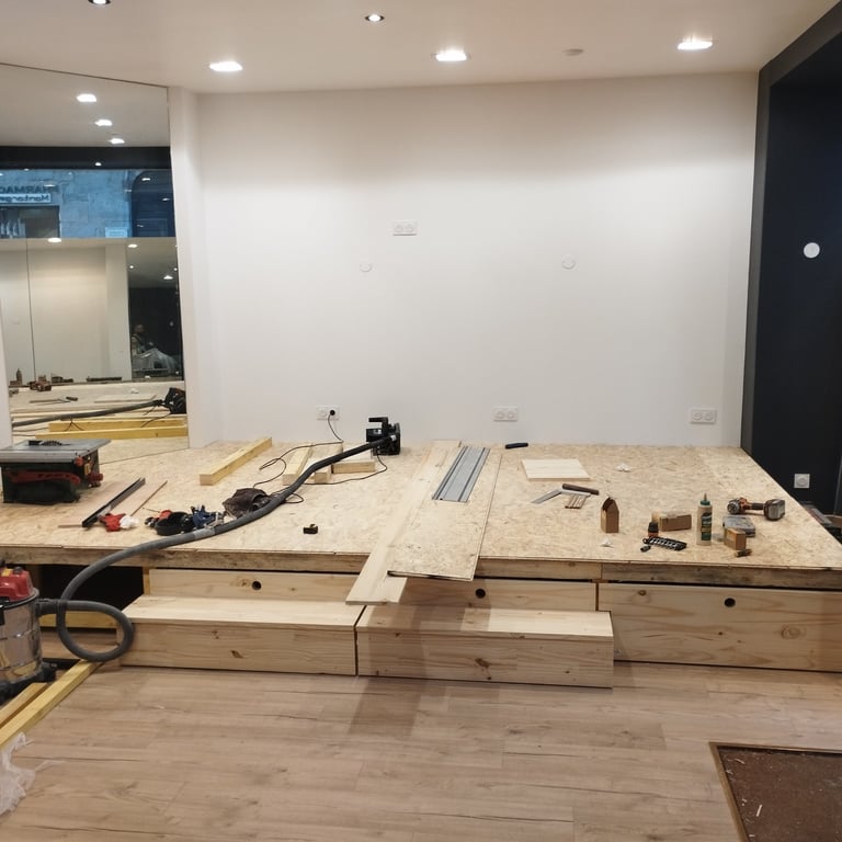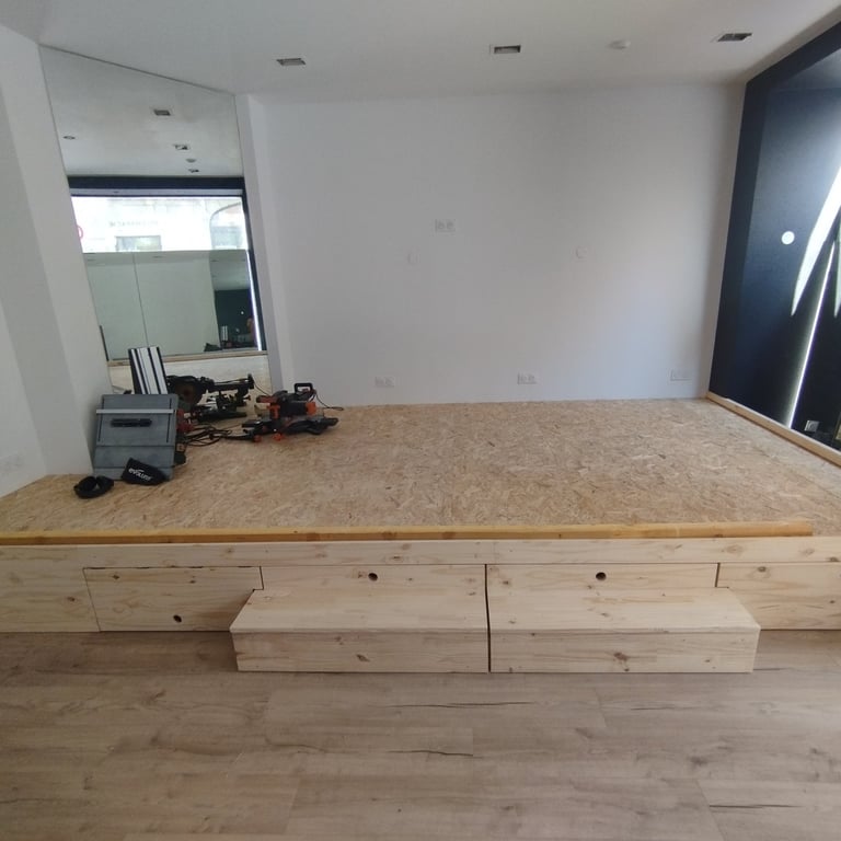 Réalisation d'une estrade structure bois pour une salle de spectacle avec tiroirs grandes tailles intégrés.