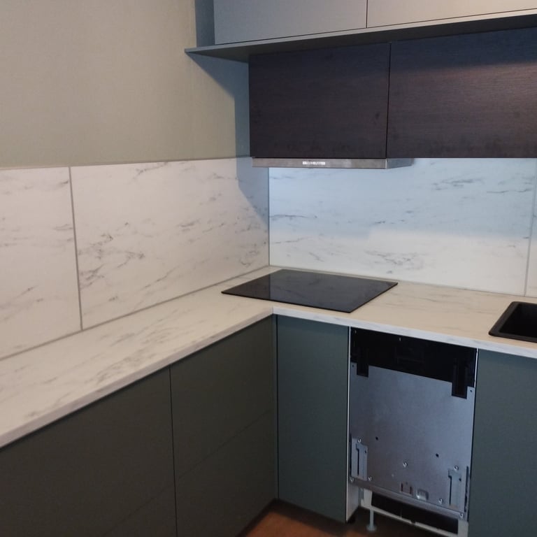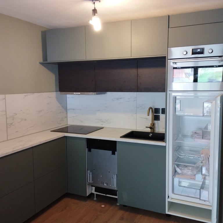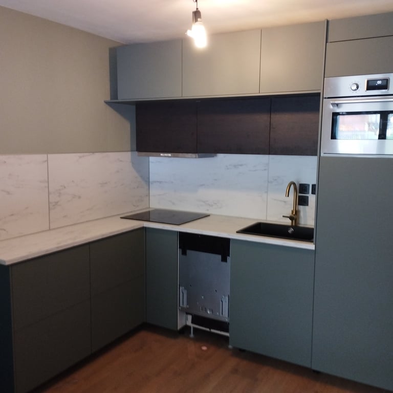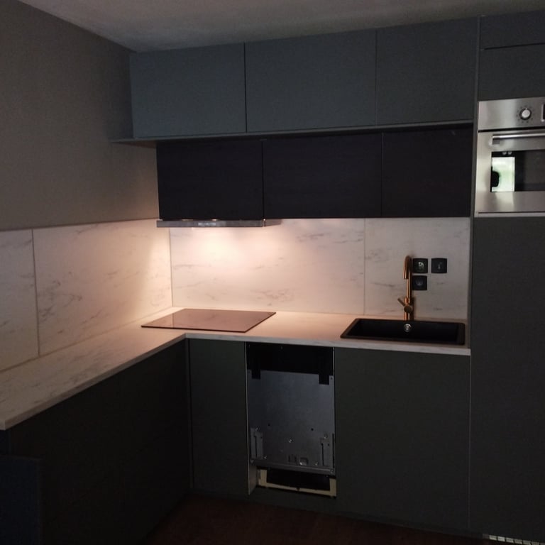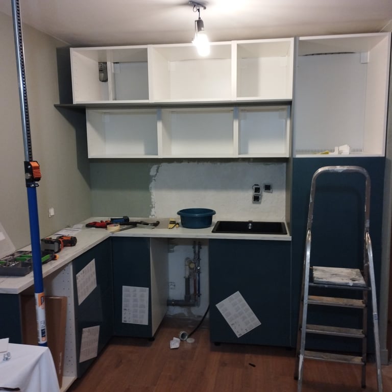 Pose d'une cuisine d'angle avec caissons hauts et électroménager intégré.