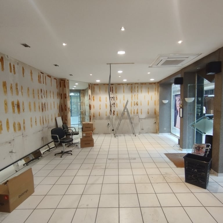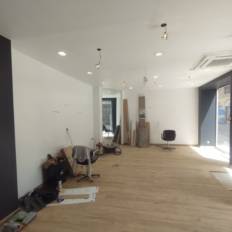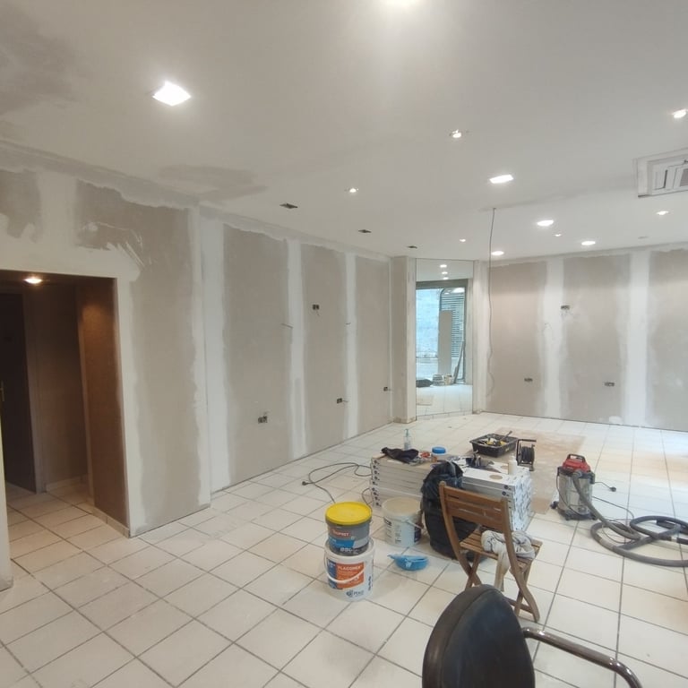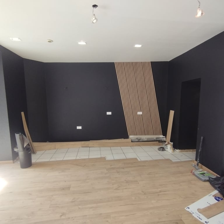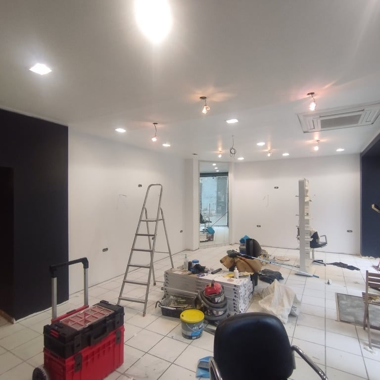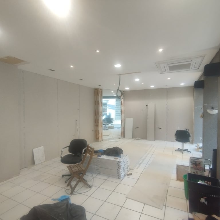 Rénovation d'un local commercial. Pose de plaque de plâtre sur les murs, mise en peinture, pose d'un sol en dalle pvc, aménagements intérieurs.