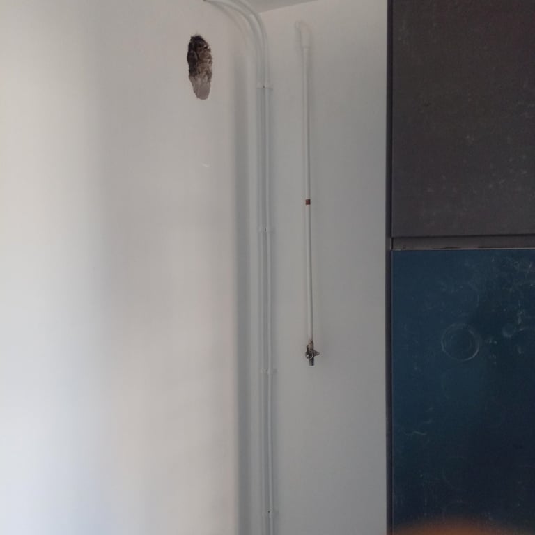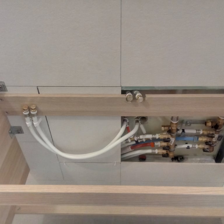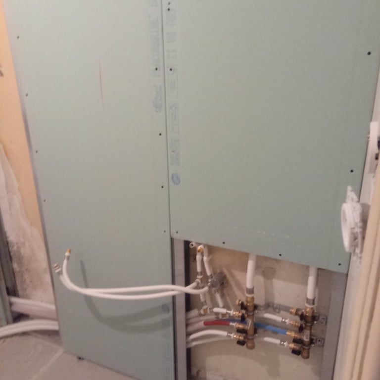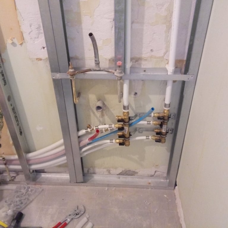 Changement de toute l'ancienne plomberie en cuivre passant dans la dalle par nouvelle tuyauterie en multicouche. Pose de nourrices afin d'isoler chaque circuit (sdb, cuisine, chambres)