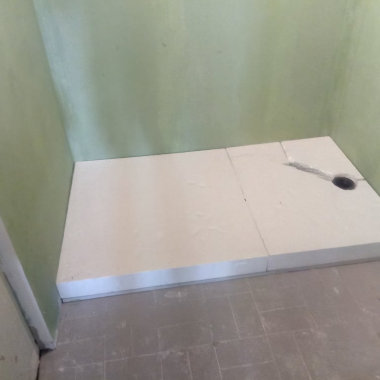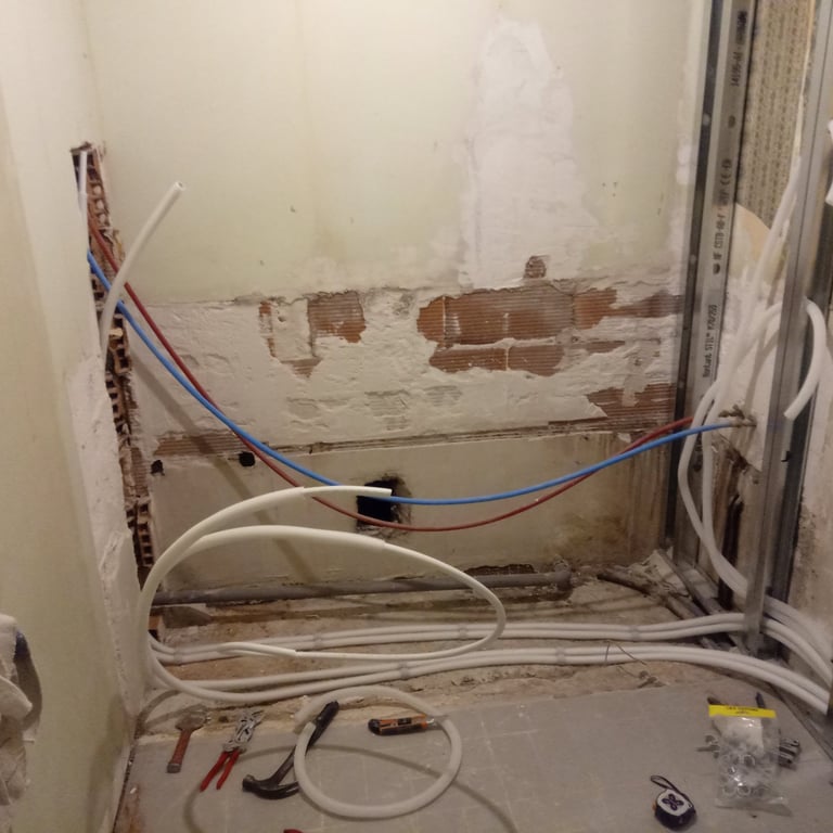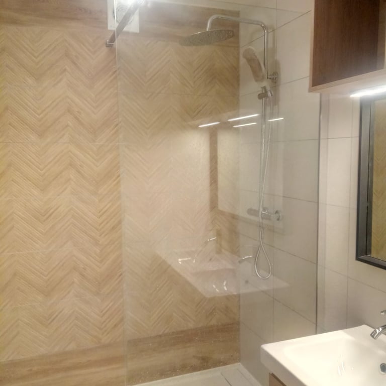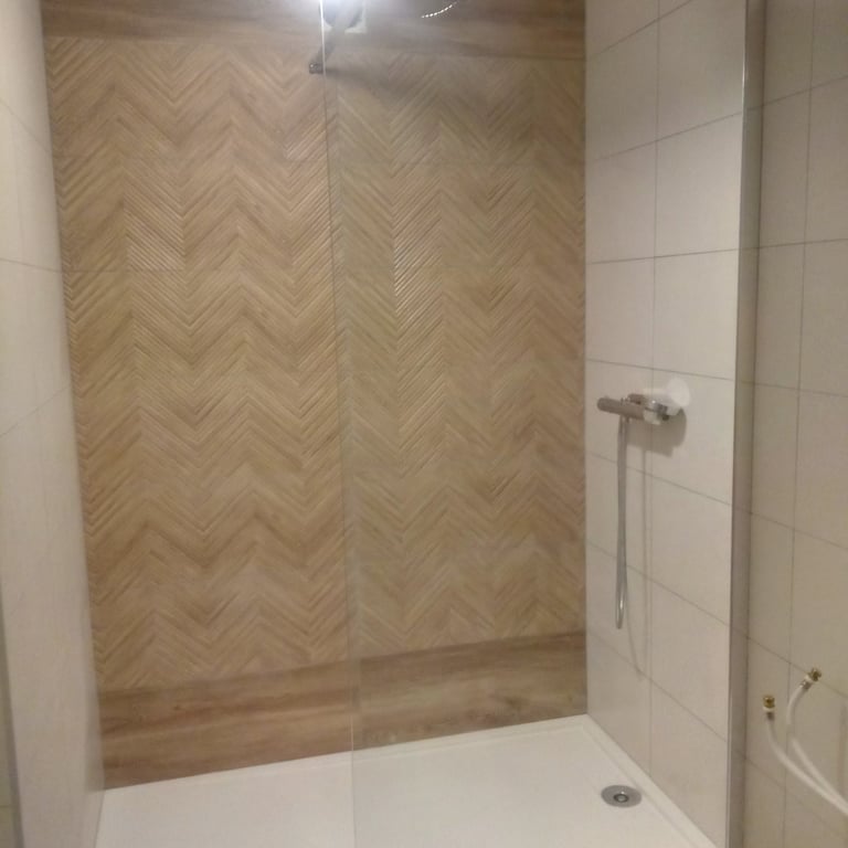 Remplacement de l'ancienne baignoire par une douche à l'italienne. Remplacement de toute la plomberie par du muticouche gainé et étanchéité des murs sous carrelage.